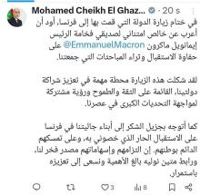 “في ختام زيارة الدولة التي قمت بها إلى فرنسا، أود أن أعرب عن خالص امتناني لصديقي فخامة الرئيس إيمانويل ماكرون EmmanuelMacron@ على حفاوة الاستقبال وثراء المباحثات التي جمعتنا.