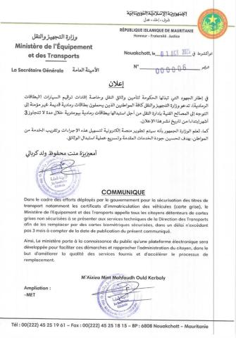 دعت وزارة التجهيز والنقل إلى استبدال البطاقات الرمادية غير المؤمنة ببطاقات رمادية بيومترية خلال ثلاثة أشهر.