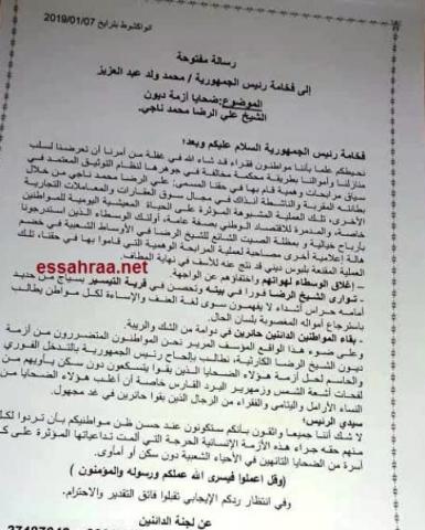 وجه دائنو الشيخ الرضا رسالة إلى الرئيس محمد ولد عبد العزيز حول قضية الديون التي يطالبون بها منذ سنوات.