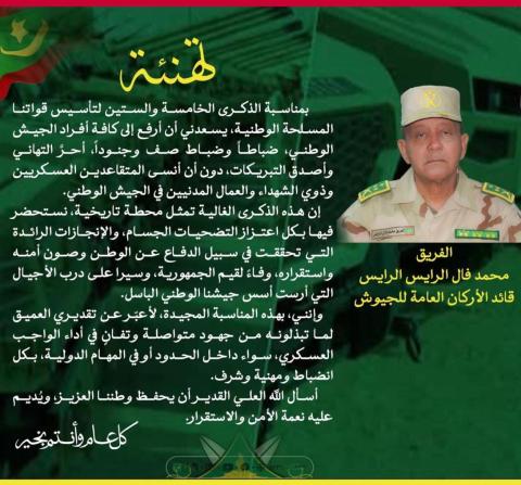 وجّه قائد الأركان العامة للجيوش، الفريق محمد فال ولد الرايس، تهانيه إلى أفراد الجيش الوطني بمناسبة الذكرى الخامسة والستين لتأسيس القوات المسلحة، موجهاً التهنئة للضباط وضباط الصف والجنود، إضافة إلى المتقاعدين وذوي الشهداء والعمال المدنيين في الجيش.