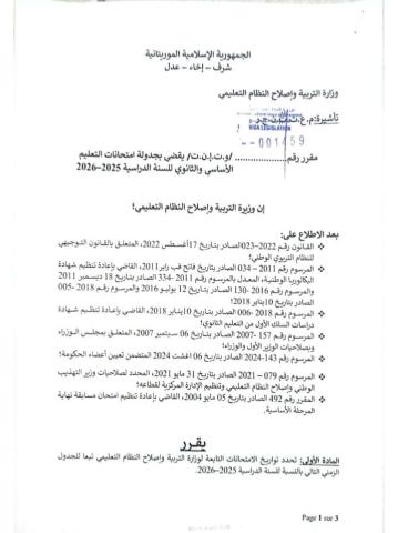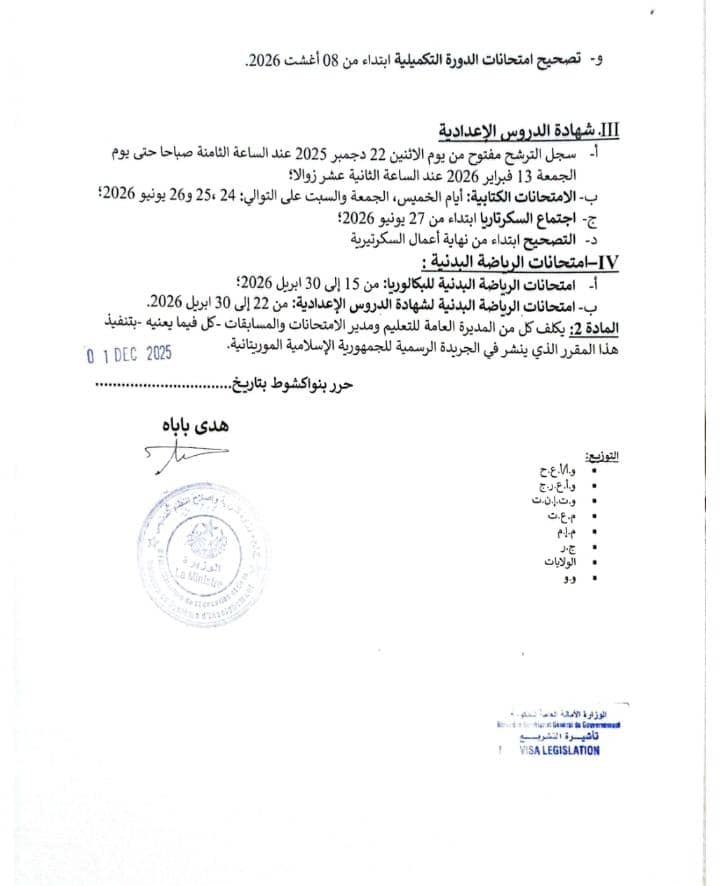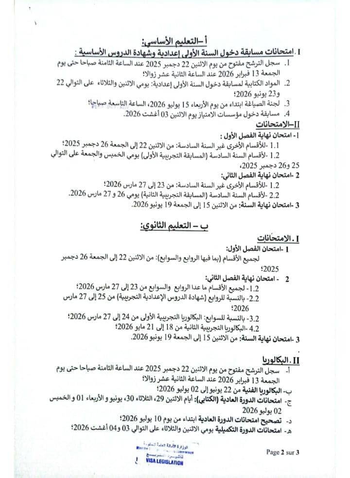 وتضمن قرار الوزارة أن مسابقة ختم الدروس الابتدائية "كنكور" لعام 2026 ستنظم يوم 22 يونيو، على أن تنظم مسابقة ختم الدروس الإعدادية "بريف" يوم 24 يونيو، فيما ينظم امتحان شهادة البكالوريا 2026 يوم 29 يونيو.