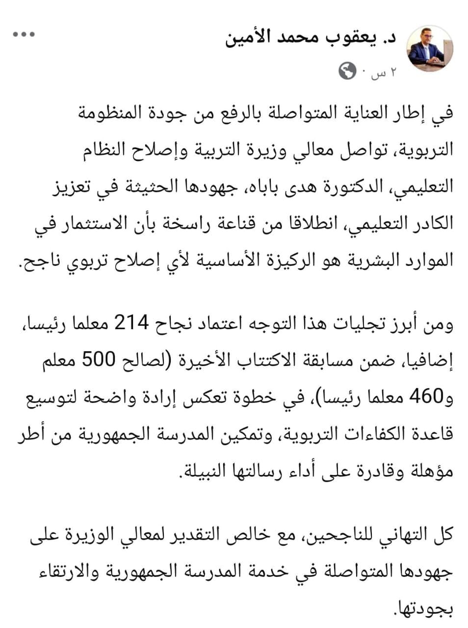 أعلنت وزارة التربية وإصلاح النظام التعليمي اعتماد نجاح 214 معلماً رئيساً إضافياً، ضمن نتائج مسابقة الاكتتاب الأخيرة التي شملت 500 معلم و460 معلماً رئيساً.
