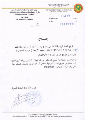 ترفع اللجنة الوطنية للأهلة إلى علم جميع المواطنين أن مراقبة هلال شهر رمضان المبارك للعام 1447هـ ستكون مساء الأربعاء (ليلة الخميس) 29 شعبان 1447هـ، الموافق 18/02/2026م.