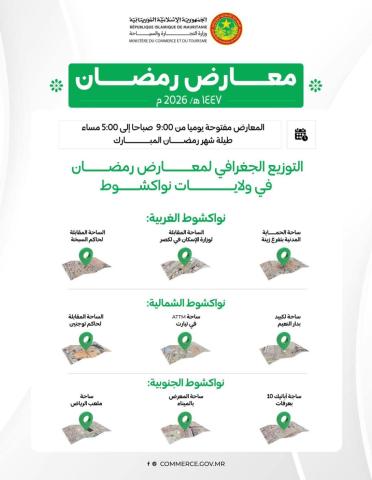 أعلنت وزارة التجارة والسياحة عن افتتاح تسعة معارض رمضانية كبرى في ولايات نواكشوط الثلاث لبيع المواد الغذائية بأسعار مخفَّضة طوال شهر رمضان المبارك، دعمًا للقدرة الشرائية للمواطنين وتوفير المواد الأساسية بأسعار مناسبة خلال الشهر الفضيل.
