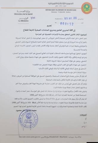 كما ألزم التعميم الممارسين بضمان تتبع المنتجات المستعملة والحصول على الموافقة المستنيرة من المرضى، مع توفير الوسائل اللازمة للتكفل بالمضاعفات المحتملة.