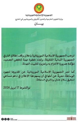 ودعت، في بيان صادر عن وزارة الشؤون الخارجية والتعاون الإفريقي والموريتانيين في الخارج، إلى الالتزام الكامل بمضامين هذا الإعلان، والعمل على تعزيزه بما يضمن استمرارية التهدئة واستقرار الوضع.