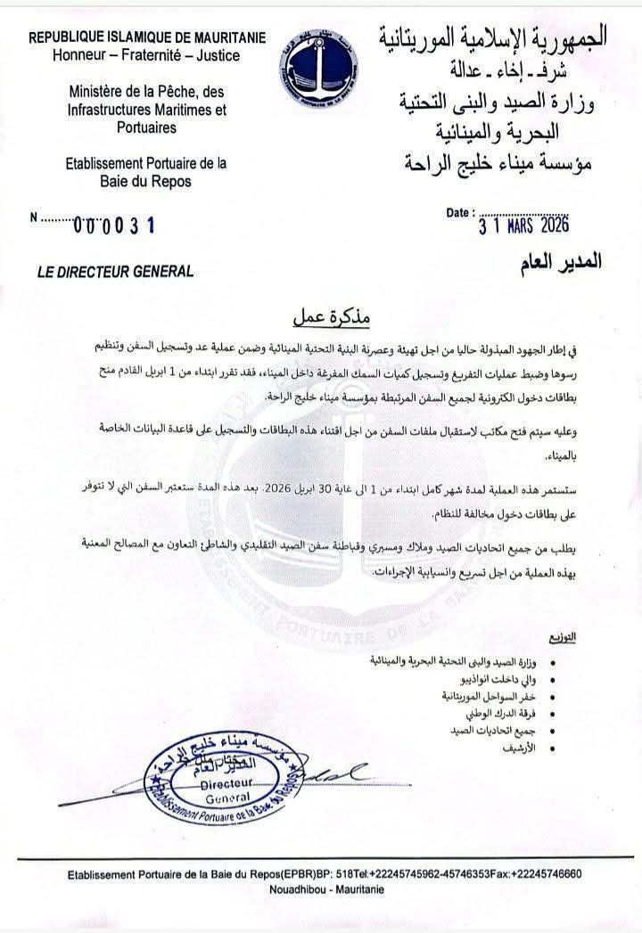 أصدرت وزارة الصيد والبنى التحتية، مذكرة عمل أعلنت من خلالها عن إجراءات جديدة في مجال الصيد، تهدف إلى اقتناء بطاقة إلكترونية لدخول الميناء